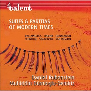 Suites & Partitas of Modern Times, Talent Records DOM 2910 125. Daniel Rubenstein, violin and Muhiddin Durruglu-Demiriz, piano. Featured composers include Don Freund-Sonapartita, Noch Nach Bach, Igor Stravinsky, Witold Ludoslawski, Frederik van Rossum, Alfred Schnittke, Luigi Dallapiccola