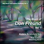 The Music of Don Freund Vol. 1: Madame Bovary Ballet Suite, Soft Cells, Viola Concerto, Dissolving Music; IUSM-10. Madame Bovary Ballet Suite (From Part I, Part II, Part III), Soft Cells for 15 Instruments,Viola Concerto in One Movement, Dissolving Music-Rockpiece for soprano and six instruments. Performers:Indiana University Concert Orchestra conducted by Don Freund; Indiana University Chamber Orchestra conducted by Paul Biss; Indiana University New Music Ensemble conducted by David Dzubay; Moira Smiley, soprano